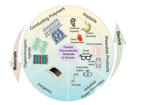 能量在使用过程中大多以废热形式排出浪费,热电材料可将热能直接转换为电能从而提高能量利用率。如今随着多功能、微型电子技术和产品的不断发展,探索大功率的微瓦—毫瓦自充电技术显得尤为重要。柔性热电材料和器件可以利用较小的温差进行发电,而且除了工业废热,自然界中的光热和人体热能等均可作为其可持续的绿色能量来源,因此在为可穿戴和可植入电子产品提供持续的电源动力方面展现出巨大的应用潜力。